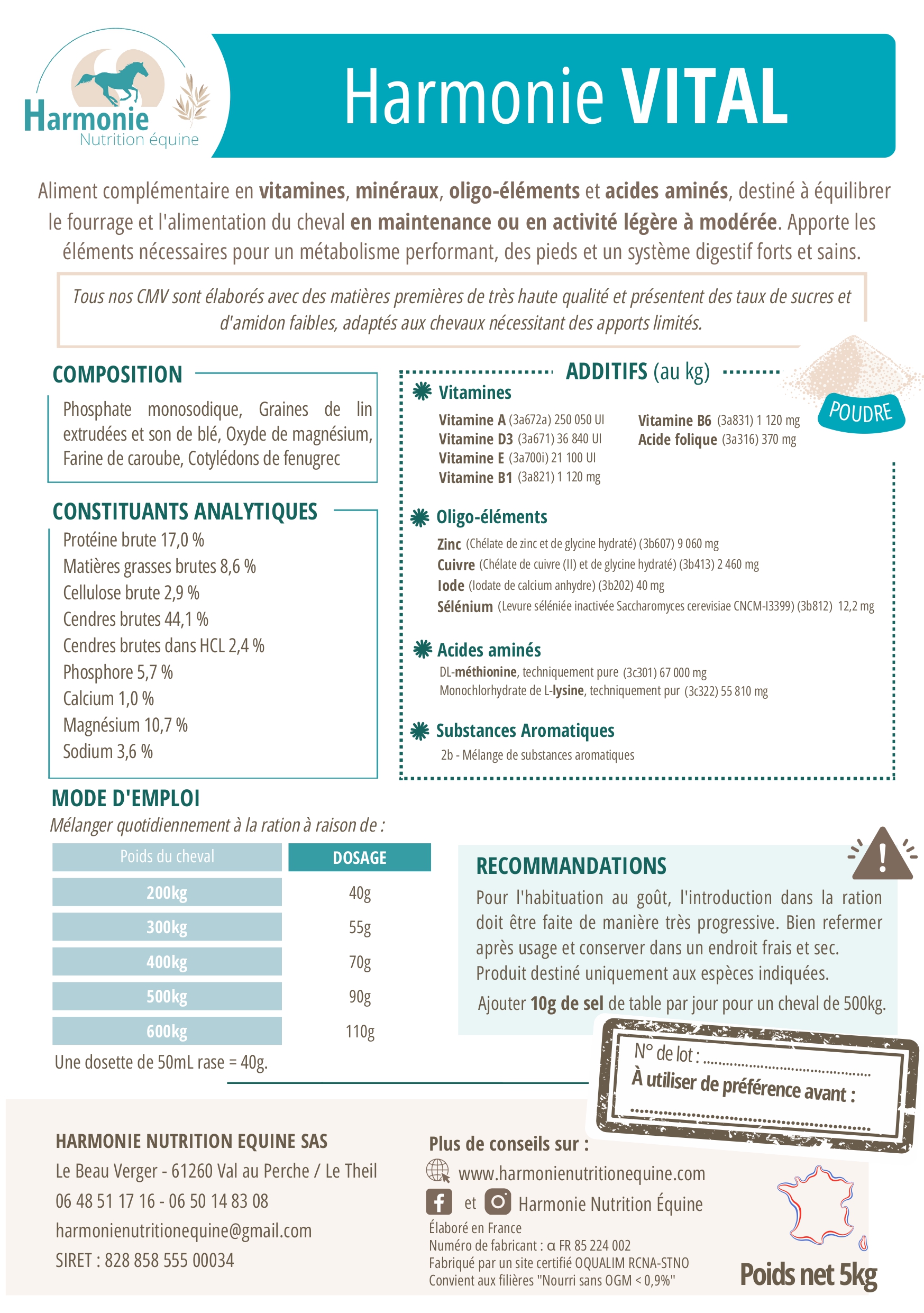 Phosphate monosodique, graines de lin extrudées, oxyde de magnésium, son de blé, farine de caroube, cotylédon de fenugrec